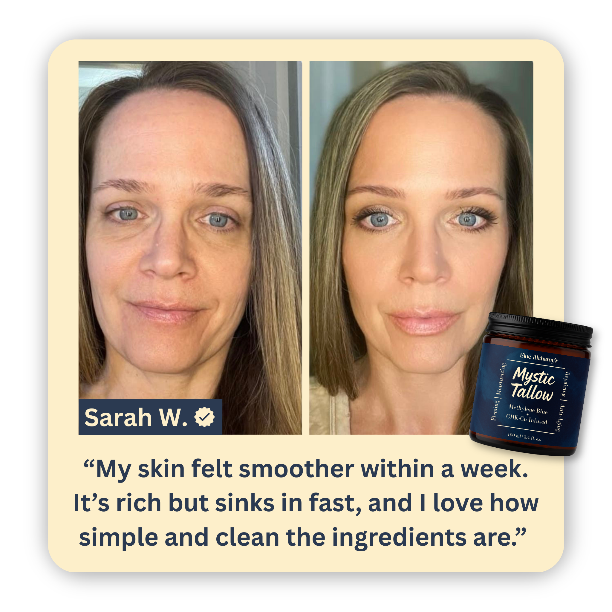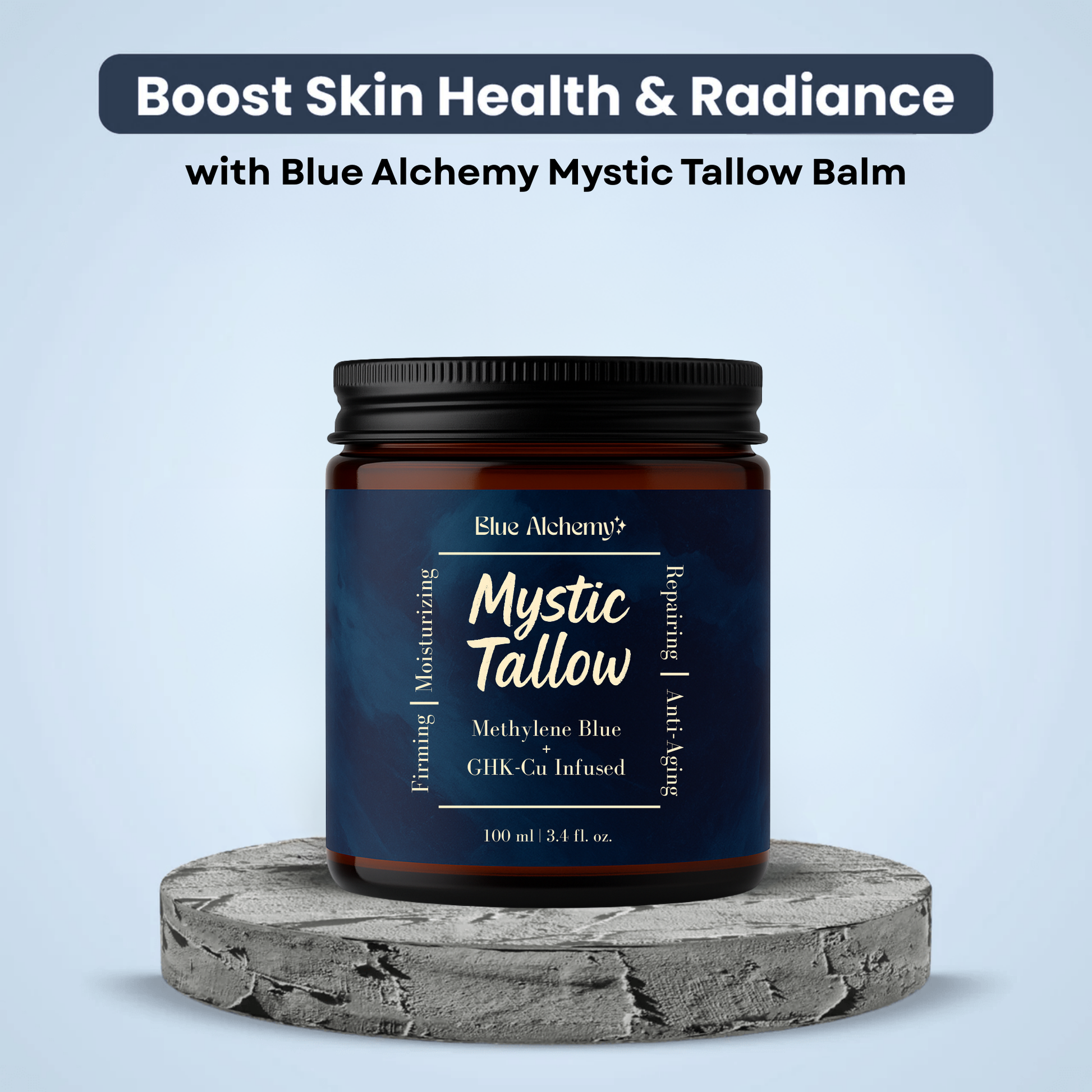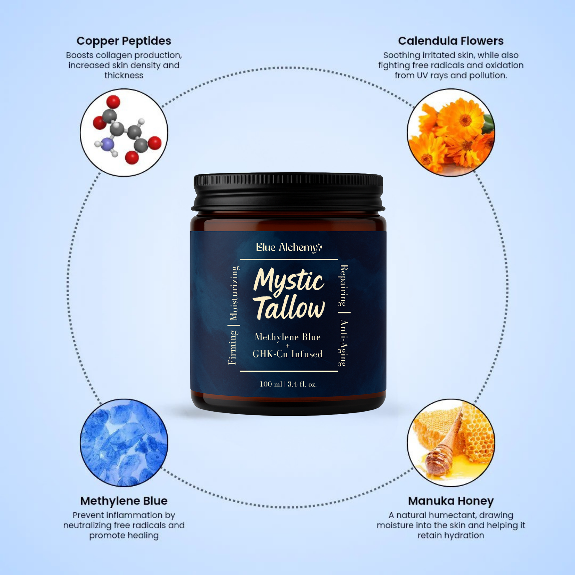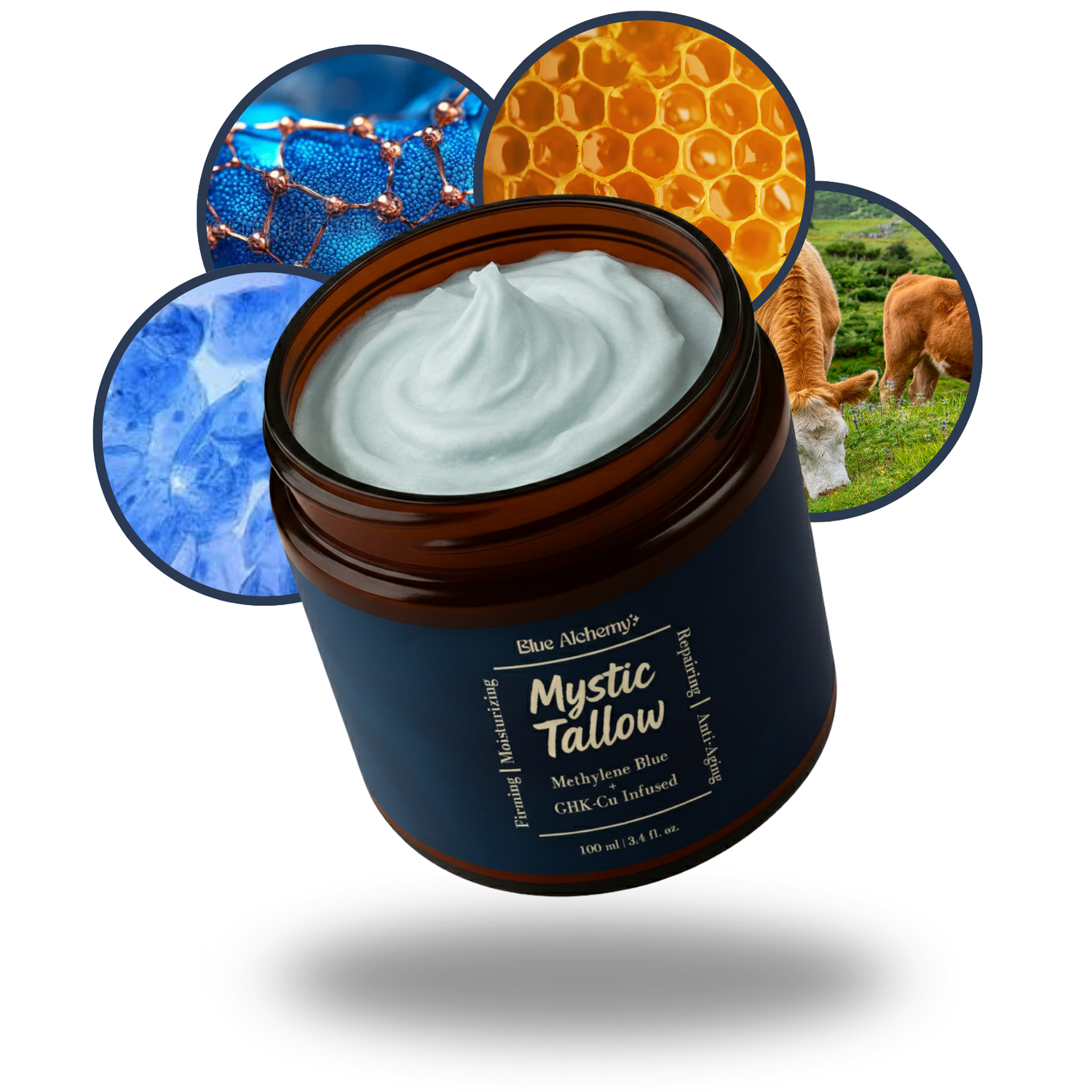 Mystic Tallow is enhanced with methylene blue, copper peptides, and honey—bringing advanced antioxidant and anti-aging benefits beyond basic moisture.